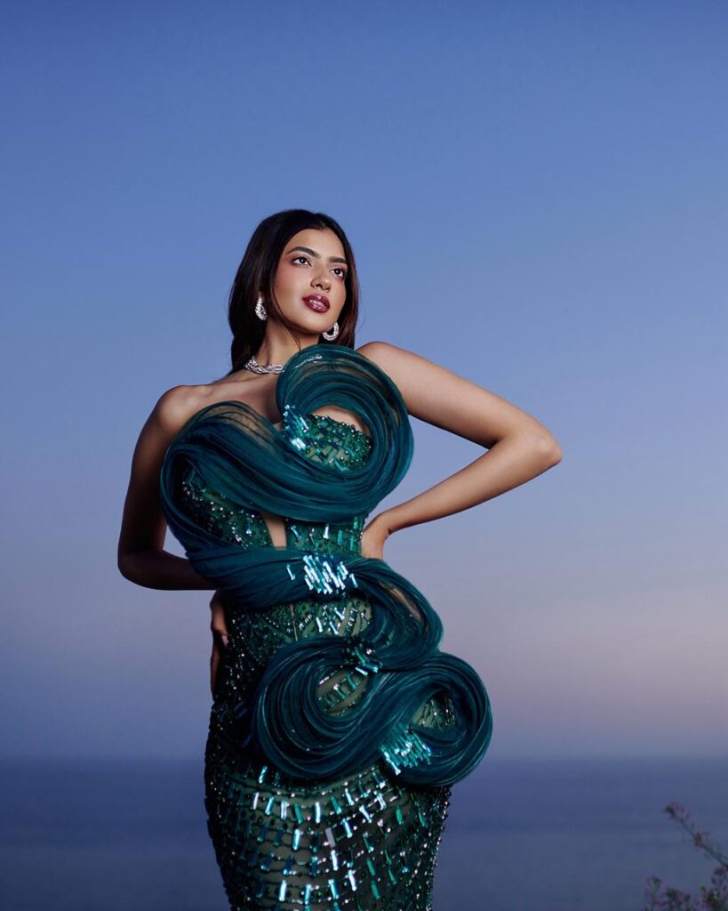 Then comes her emerald-green sculpted masterpiece, a daring play of structure and fluidity. The futuristic design, with its artful swirls and crystal embellishments, mirrors Kashika’s fearless approach to fashion. She doesn’t just wear couture; she brings it to life.