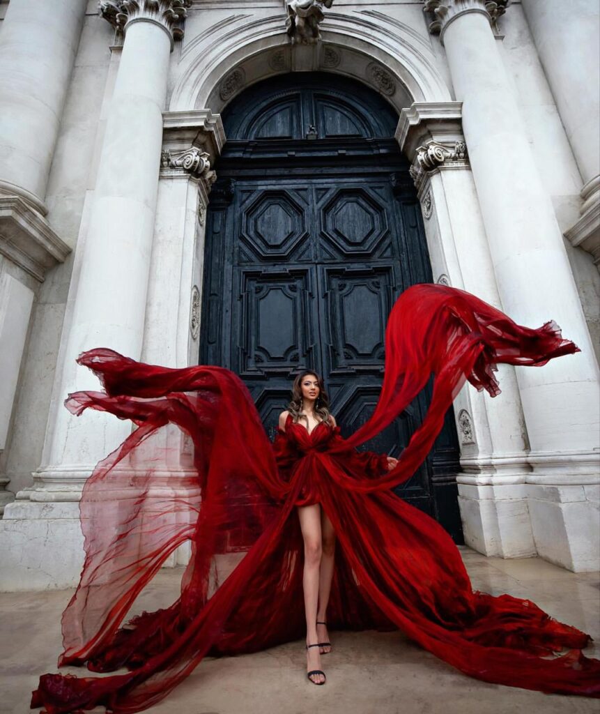 In her breathtaking crimson gown, Kashika commands attention with fluid drama and unspoken strength. The deep red, symbolizing passion and power, flows like liquid silk around her, making her presence both ethereal and grounded. “I love when an outfit makes you feel alive; it’s not just about wearing a color, it’s about owning the emotion behind it,” she says with a serene smile.