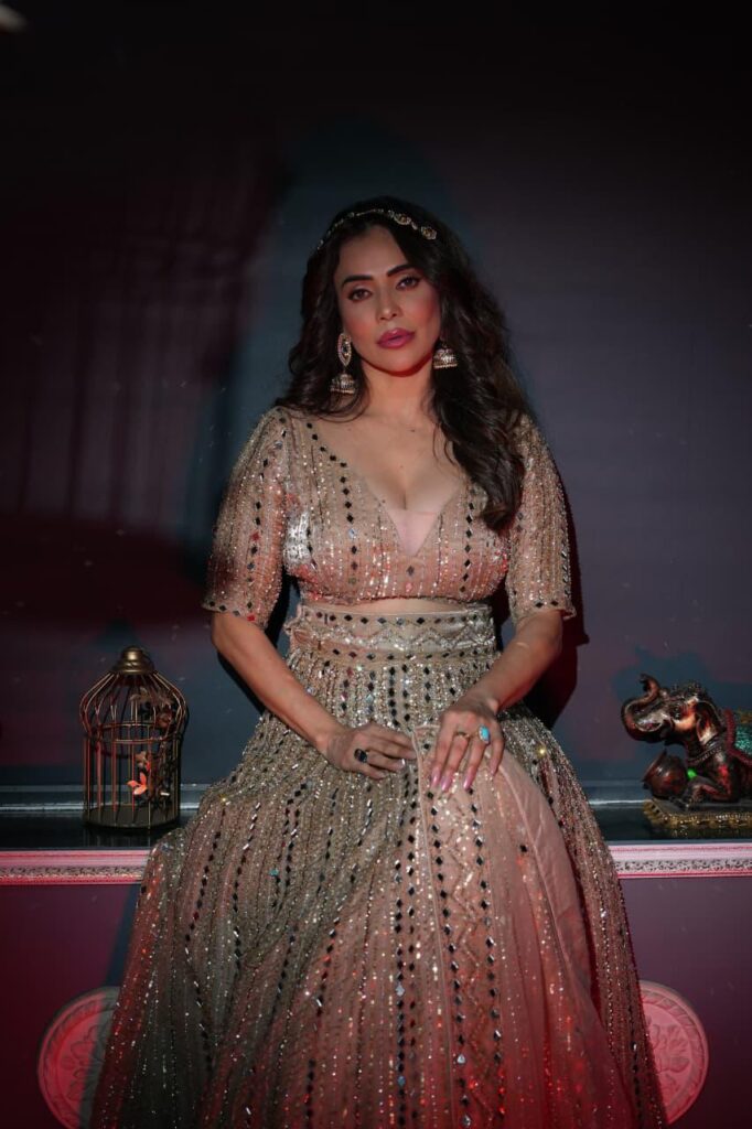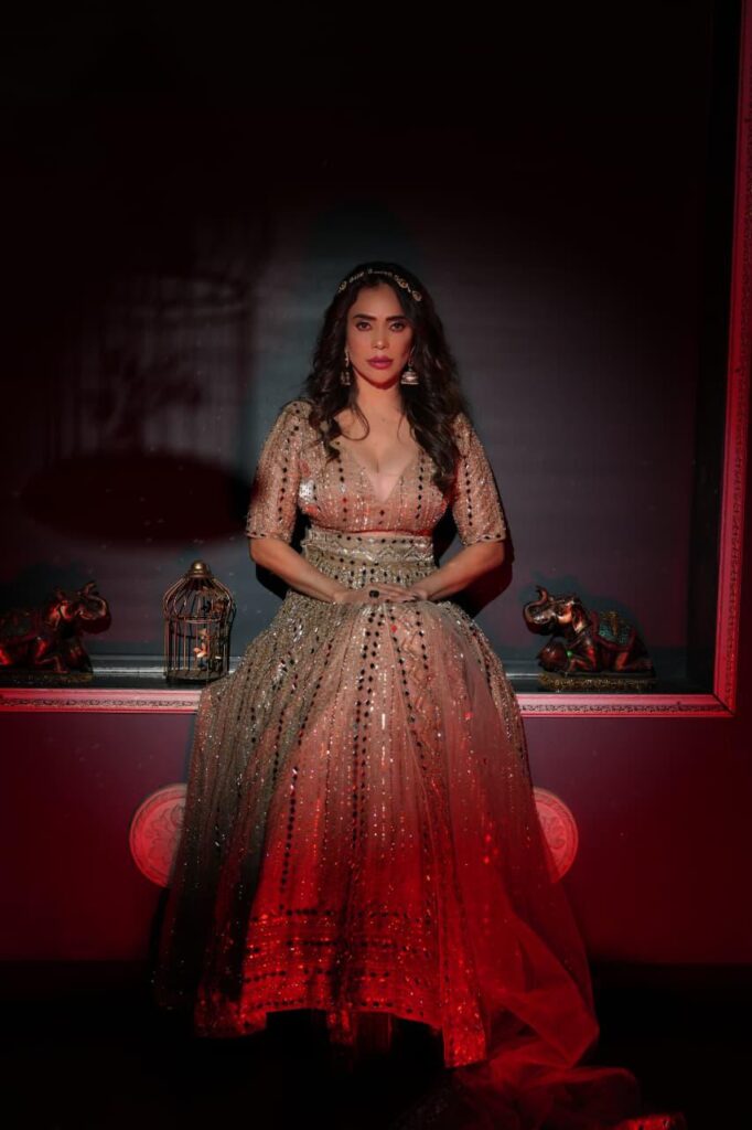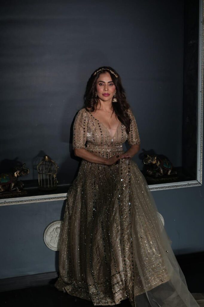 Dressed in a breathtaking golden embellished gown, layered with intricate mirror work and delicate sequin detailing, Nikita looked nothing short of ethereal. The deep neckline added a touch of bold elegance, while the flowing silhouette created a dreamy aura that sparkled under the spotlight.
