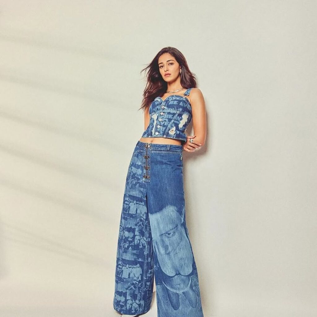 Ananya Panday: Ananya Panday rocks a structured denim top and pairs it with baggy denim jeans with prints and patchwork all across. She oozes a no-nonsense vibe and keeps it raw with metallic jewellery.