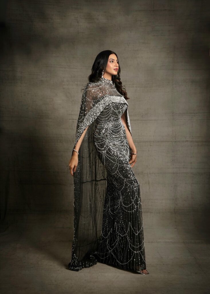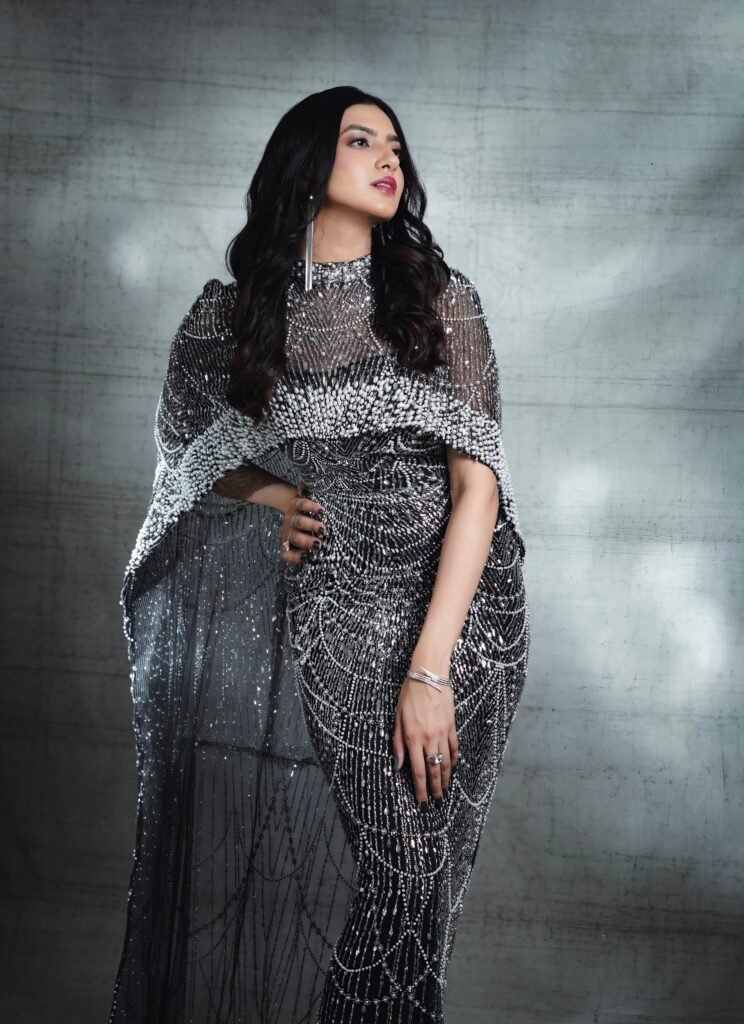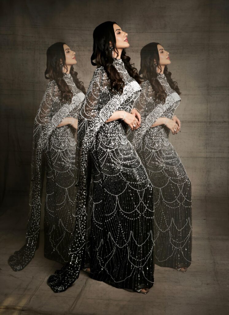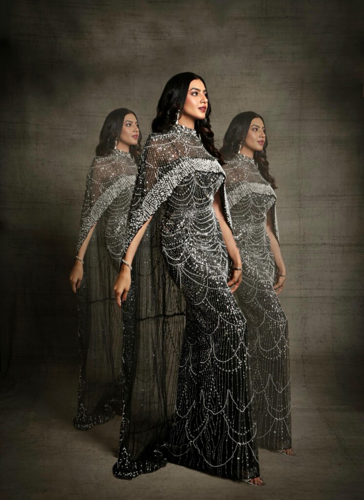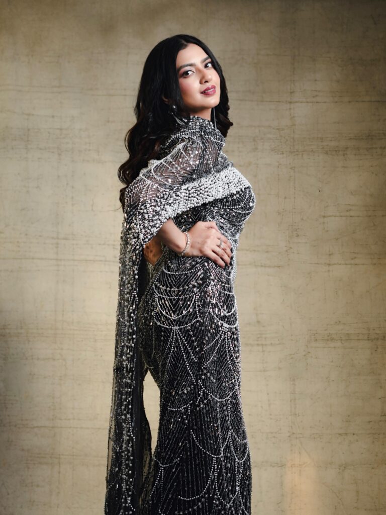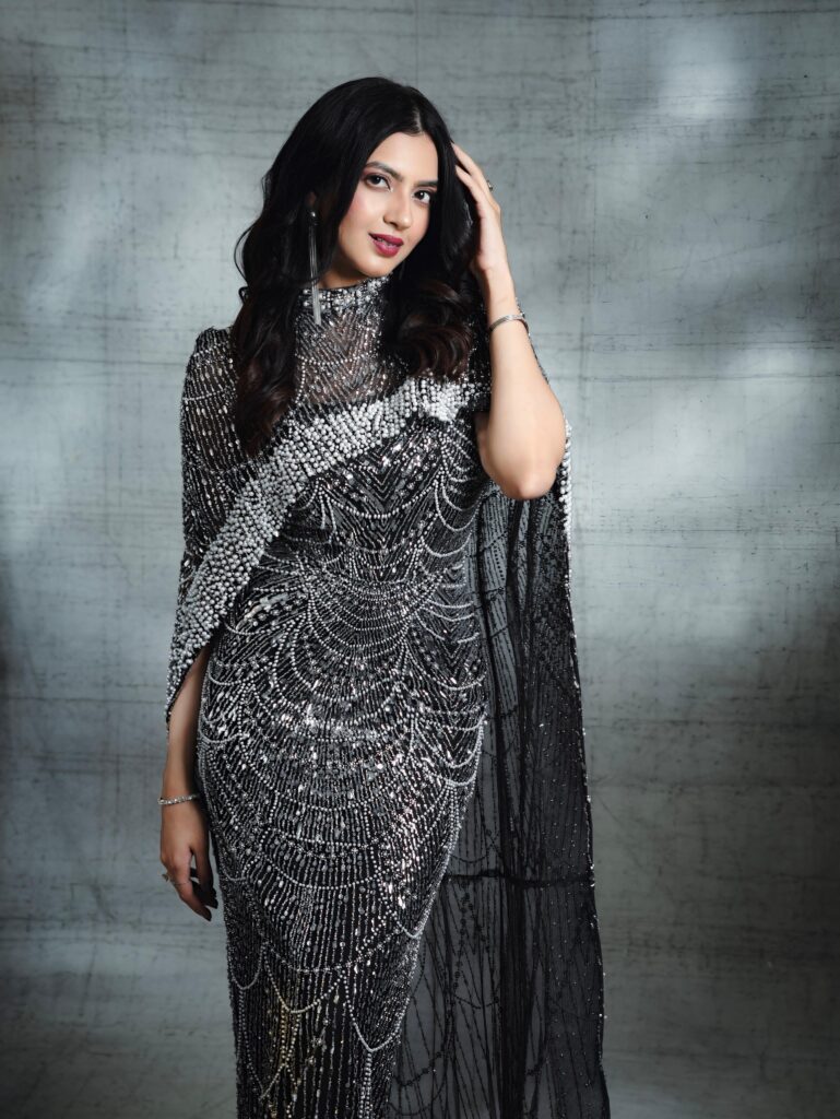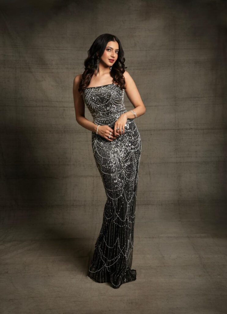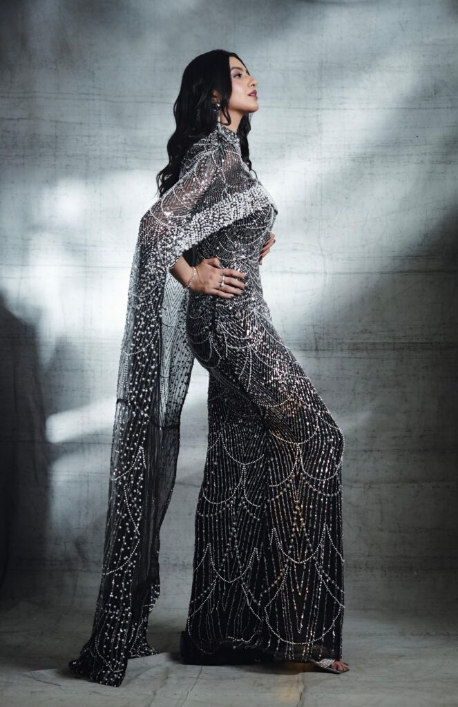 Stepping into a breathtaking black gown drenched in intricate silver beadwork, Kashika channels an ethereal blend of Old-Hollywood elegance and contemporary stardust. The silhouette, sculpted to perfection, traces her frame like liquid light, creating a visual rhythm of cascading patterns that sparkle with every breath she takes. Each photograph feels like a frame from a timeless film — poised, powerful, and impossibly graceful.