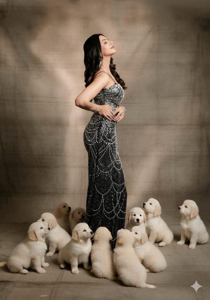 And then comes the most heart-melting twist — the frame where a circle of cream-coloured puppies surrounds her like she is their moon. It’s rare to see opulence and innocence blend so seamlessly, but Kashika carries both with an ease that’s uniquely hers. The contrast between the high-glam gown and the soft playfulness of the puppies creates an image that is instantly iconic — the kind that lingers long after you’ve scrolled past it.