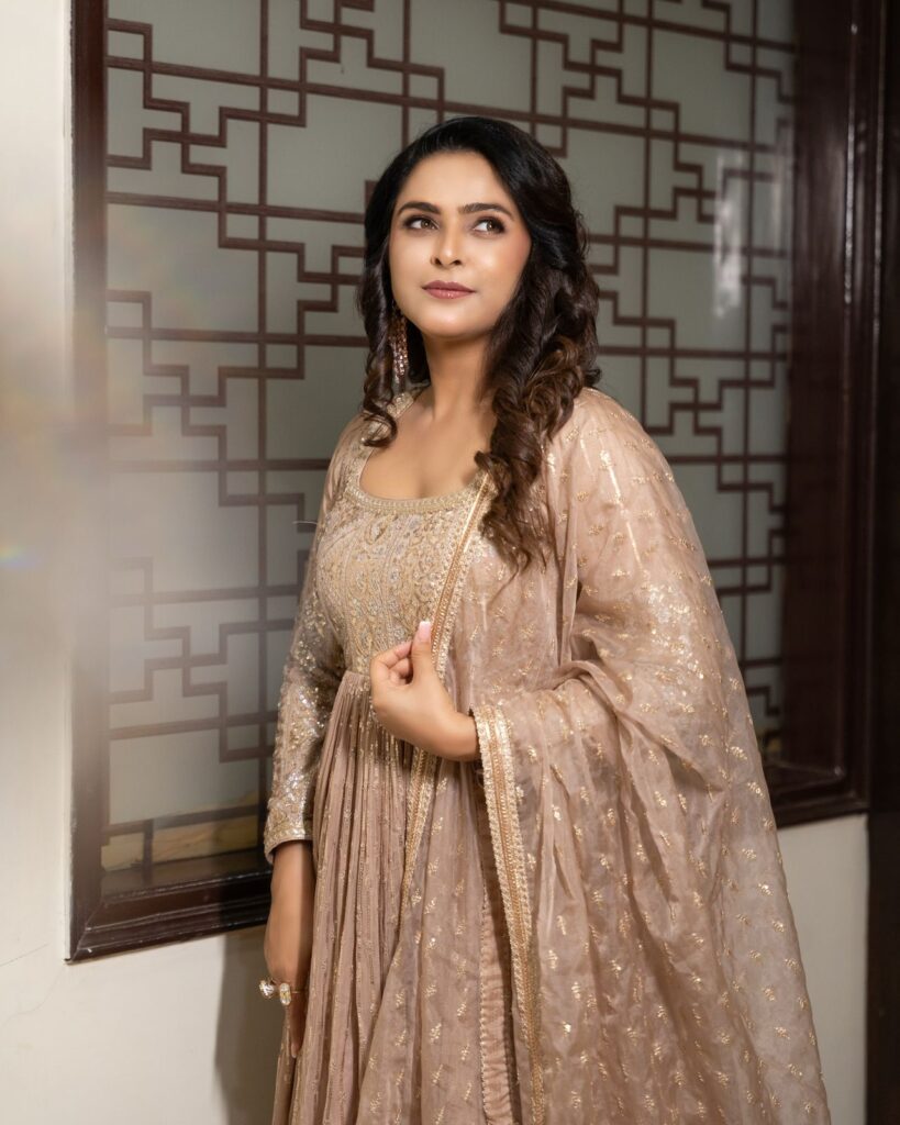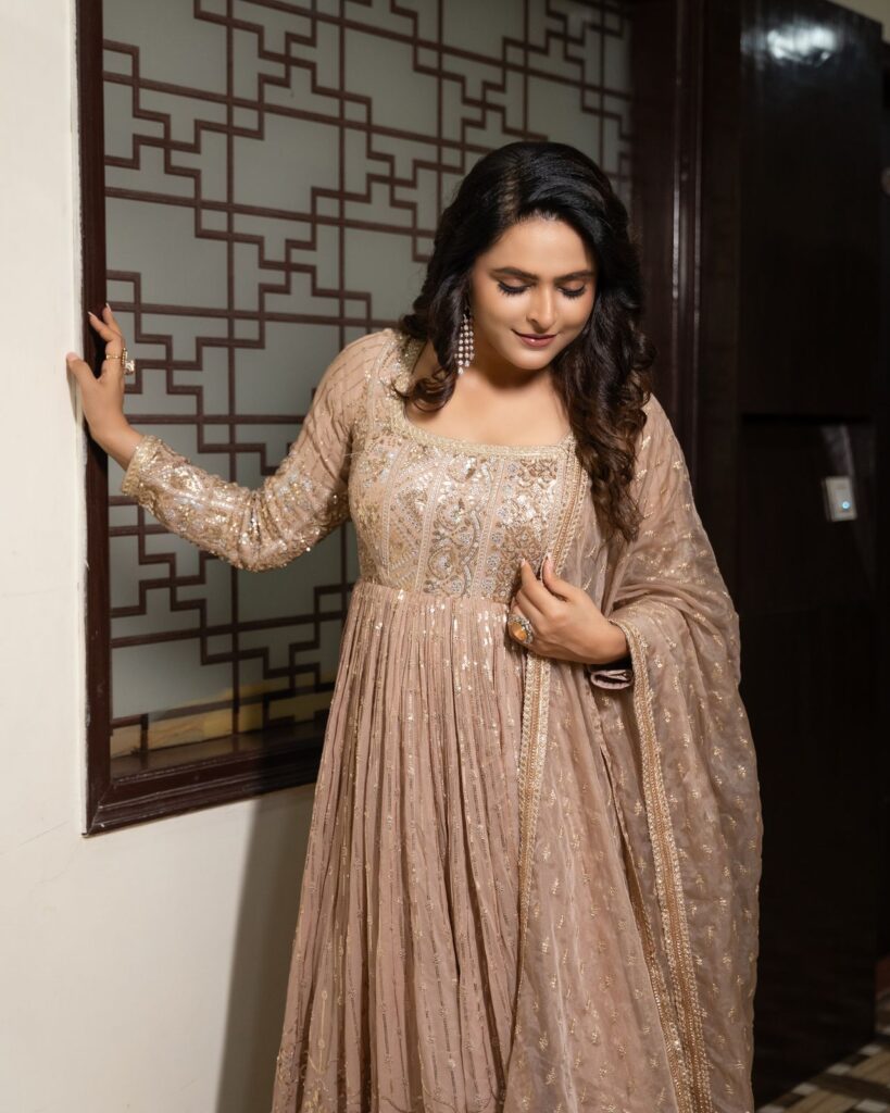 Madhurima Tuli recently managed to steal all the spotlight and attention towards her when she dazzled in a vibrant and serene limited-edition, custom-made ,Anarkali which has intricate embroidery all over it. The shimmers & the delicate tie-up detailing come off as a source of positivity to serve as the perfect mood for a gala celebration, which is all about traditional excellence. So, hey, in case you have been hunting for the perfect sangeet or mehendi night fashion inspiration or closet ideas for yourself, your search simply ends here as you get to experience the visual treat with her latest spree of delightful photos. The embellished ensemble added a regal touch with her stylish choice of accessories. From cocktail rings to a gorgeous pair of jhumkas, she had it all in her to look a complete 10/10 as a modern-day style icon. The sleek eyeshadow and the glossy nude lip accentuated her raw and natural beauty all the way more. The entire look truly serves as the perfect reminder when it comes to enduring style with a timeless appeal. Check out the gorgeous set of photos below –