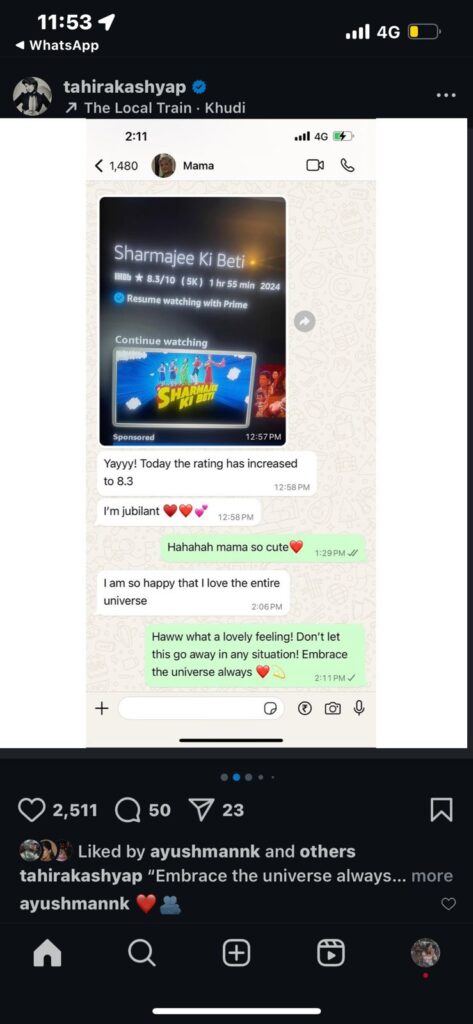 Sharing how the film holds a personal meaning to Tahira, she wrote, “Embrace the universe always 💫 The joy this film has been! 1 year since it released and a dream to make since 2017! And the film keeps getting more and more love! (My fav one is the screenshot of my conversation with mama 🥹❤ and then another one where I am a happy mama with my kids visiting my set💝)”
